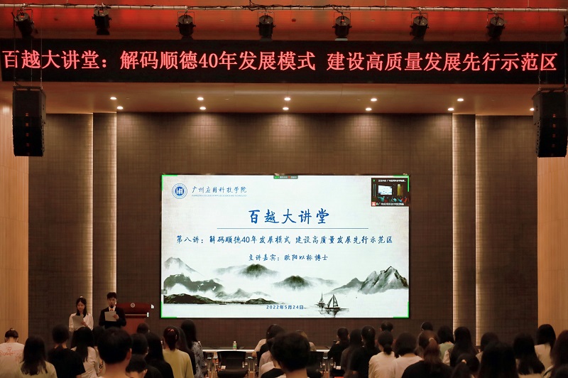 5月24日,“百越大讲堂”如期开讲。正教授级高级经济师,暨南大学、华南理工大学与顺德农商银行共建国家级博士后科研工作站负责人、博士后合作导师,广东顺德农商银行总行研究所副所长欧阳以标博士应邀为我校师生作《解码顺德40年发展模式,建设高质量发展先行示范区》线上直播讲座。主会场在行政中心一楼会议厅,各个二级学院共设10个分会场,近1100名师生聆听讲座。讲座由两名学生用中、英双语主持,副校长刘志新学术主持。