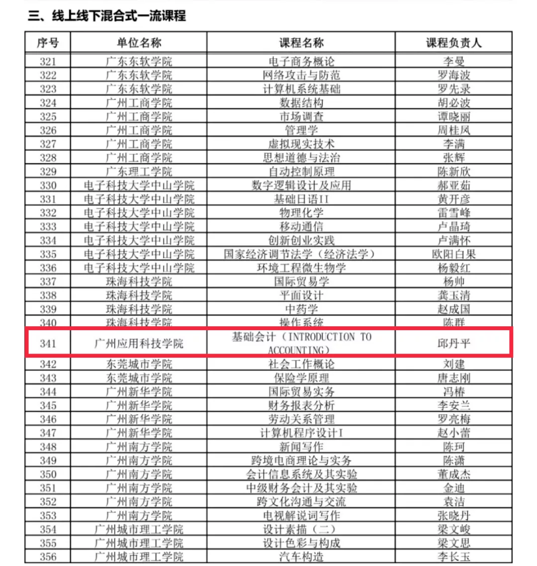 近日,广东省教育厅公示了《关于广东省2021年省一流本科课程遴选拟认定名单的公示》,我校经济与管理学院邱丹平老师负责的基础会计课程遴选认定为2021年度省一流本科课程。根据公布结果,本次遴选出广东省本科高校2021年省一流本科课程836门,包括线上一流课程、线下一流课程、线上线下混合式一流课程、社会实践一流课程等四类课程,我校基础会计课程属于线上线下混合式一流课程,本次共遴选认定369门,该类型的省一流课程在民办高校中为数不多,成绩喜人。
