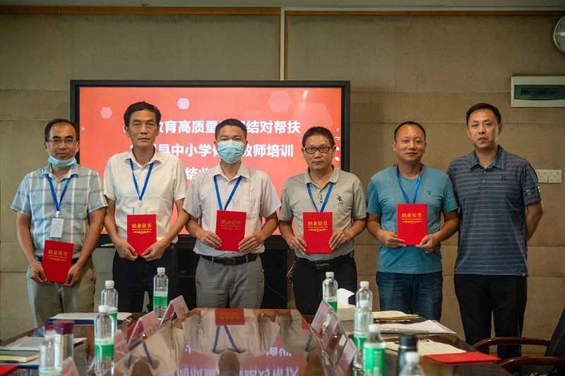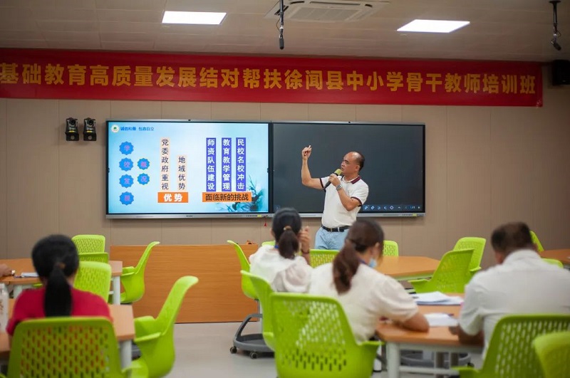 为贯彻落实省委、省政府关于推动基础教育高质量发展的工作要求,做好全口径全方位融入式帮扶粤东粤西粤北地区基础教育高质量发展工作,7月18日—21日,基础教育高质量发展结对帮扶——徐闻县中小学骨干教师培训在我校举行。来自湛江徐闻县下桥镇中心小学、西连镇瓜藤小学、西连镇石马小学、西连镇乐琴小学、西连镇龙腋小学、城北乡中心小学、角尾乡中心小学等学校的校长和教师代表参加了培训。我校副校长李江凌、校长助理欧仕身代表学校主持此次帮扶培训。