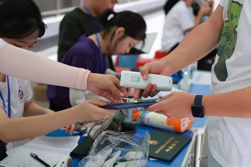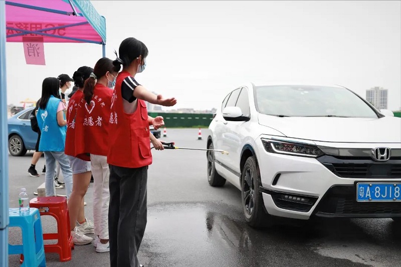 为做好疫情防控常态化条件下的新生报到,学校严格落实疫情防控工作,在校门外设置12个防控点位,保安和志愿者为新生和家长扫码测温平安进入校园。