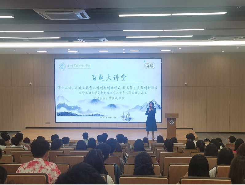9月27日下午,“百越大讲堂”第十二讲开讲。大连海事大学博士生导师、原辽宁工业大学校长佟绍成教授应邀为我校师生作《构建应用型本科创新创业模式 提高学生实践创新能力》专题讲座。学校党委副书记、副校长刘志新,创新创业学院院长荀海鹏以及300余名师生聆听讲座。讲座由两名学生中、英双语主持,副校长刘志新教授担任学术主持。