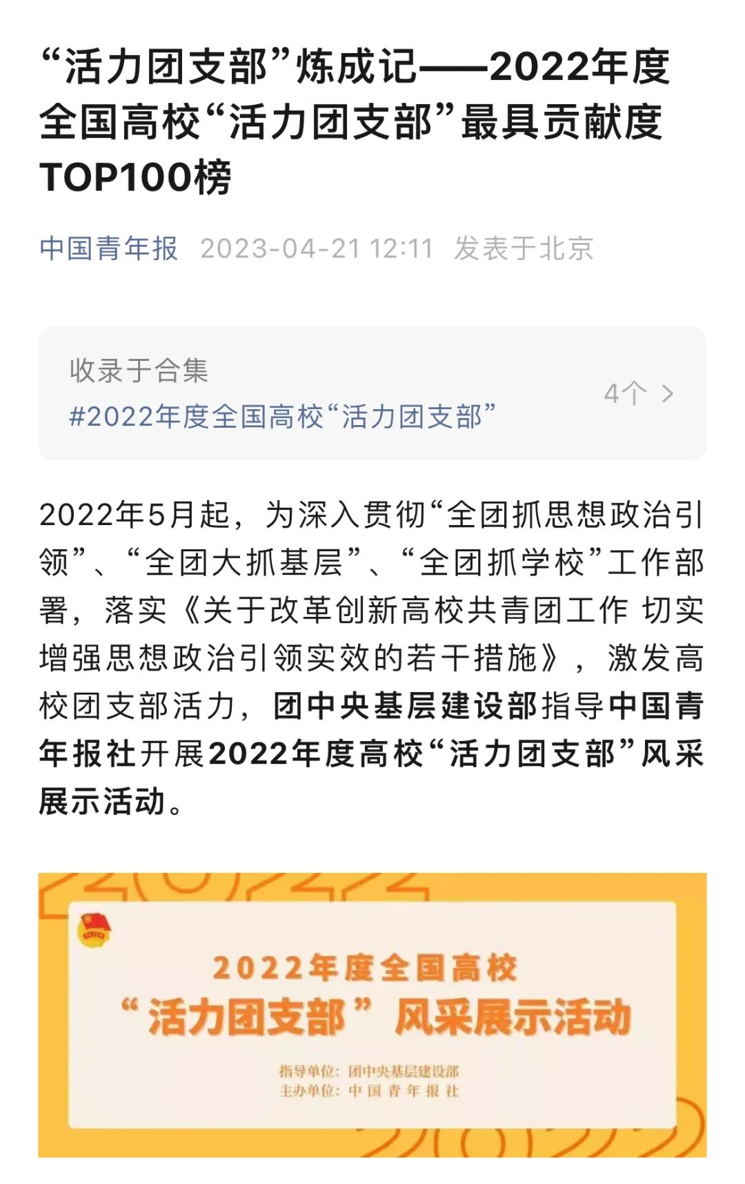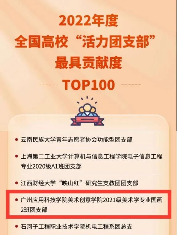 2022年度高校“活力团支部”风采展示活动,在引领力、组织力、服务力、贡献度、改革味、好作风6个方面,活动通过新媒体方式集中展现高校团支部改革建设成果和典型经验。其中,贡献度方面,重点围绕“实施大学生社区实践计划,组织团员青年有计划、经常性、机制化到城乡社区和青年之家报到,积极参与校内外志愿服务、社会实践等活动,同学的社会化能力得到提升”等方面,经过校内选树、校级展示、省级展示、全国展示等环节,形成《2022年度全国高校“活力团支部”最具贡献度TOP100榜》。我校2021级国画2班团支部立足新起点,抓住新机遇,不断强化青年思想政治引领,争做有理想、敢担当、能吃苦、肯奋斗的新时代好青年集体,成功入选“活力团支部”最具贡献榜榜单。