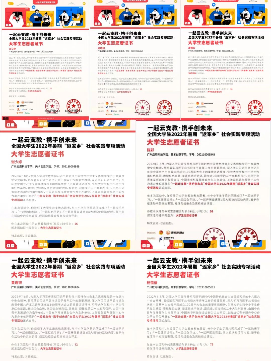 在“一起云支教,携手创未来”全国大学生2022年暑假“返家乡”社会实践专项活动中,团支部成员杨蓓蓓、黄逸锌等8名同学积极参与。通过线上线下方式,以多种形式向不同地区的青少年传递红色文化、讲好红色故事,也为许多留守儿童、单亲家庭儿童、贫困家庭儿童等带来温暖。