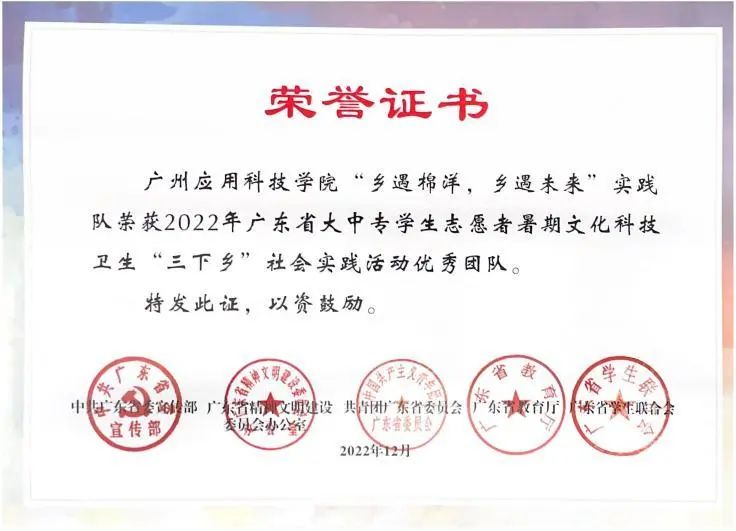 杨蓓蓓同学在暑期期间参与了广州应用科技学院美术创意学院组织的“乡遇棉洋、乡遇未来”三下乡社会实践活动。作为社会实践队中的一员,杨蓓蓓同学将艺术的美下沉到乡村讲堂之中,把所学的专业知识转化为通俗易懂的话语,让乡村的孩子们领悟到了美的涵义,将红色精神发扬传承。其队伍也成功荣获广东省大中专学生志愿者暑期文化科技卫生“三下乡”社会实践活动优秀团队。