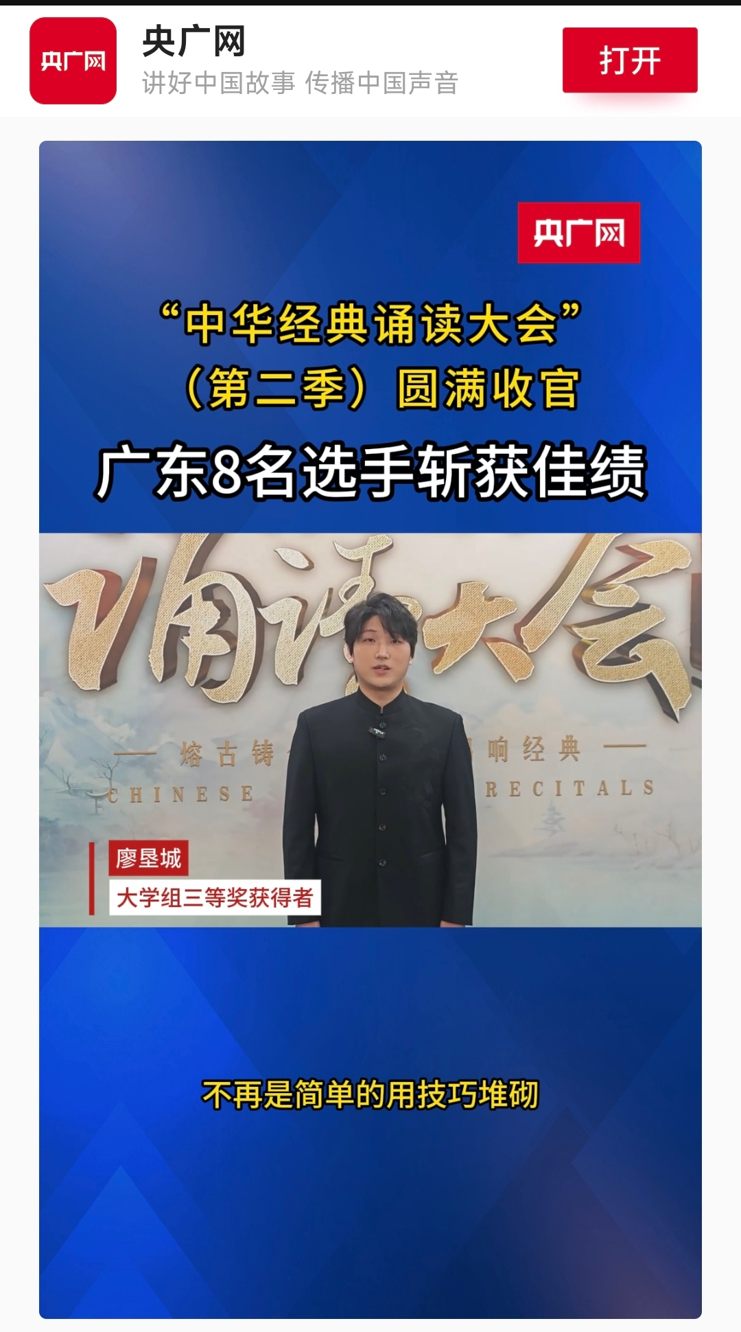 点击图片:回顾广应科专场“中华经典诵读大会”是央广网重点打造的公益文化IP,旨在弘扬中华优秀传统文化,引导全民与经典对话。2023年,央广网特别策划推出第一季“中华经典诵读大会”,这一大型文化展演活动在全国范围内掀起传颂经典的热潮,并被中央网信办评为“2023中国正能量网络精品”。